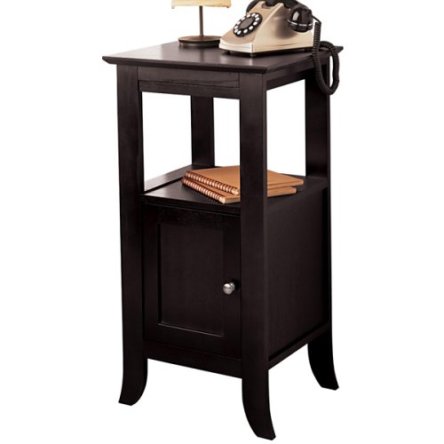Create an organized call center in your kitchen, family room or bedroom with this Furio telephone table. Made of solid wood with a dark walnut finish, it features a wood and laminate top, middle shelf and flared legs. An enclosed storage area with a chrome-handled door keeps phone books out of sight. Imported. 33-1/2Hx17-3/4Wx15-3/4D".
